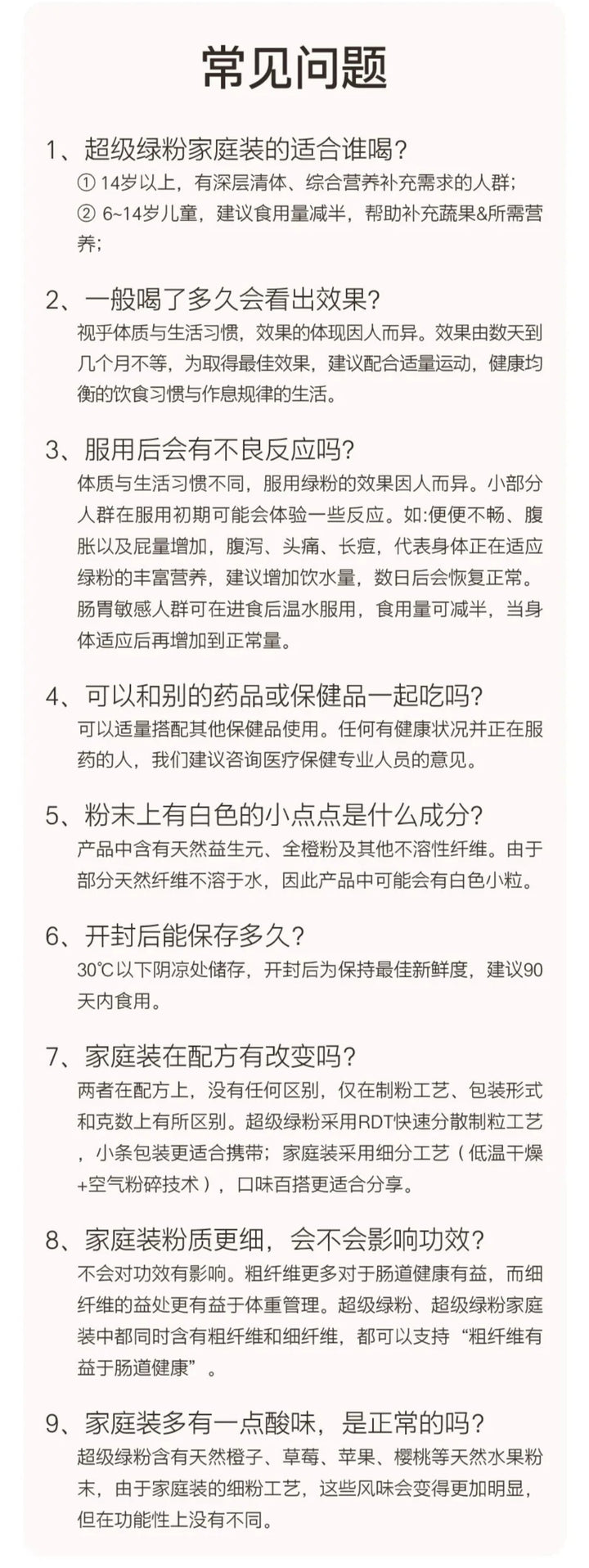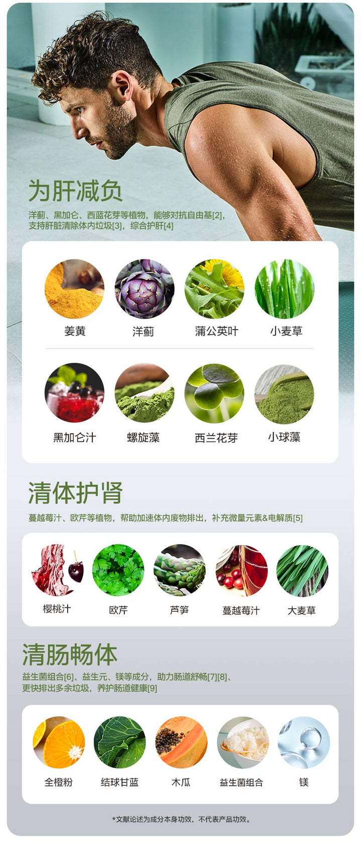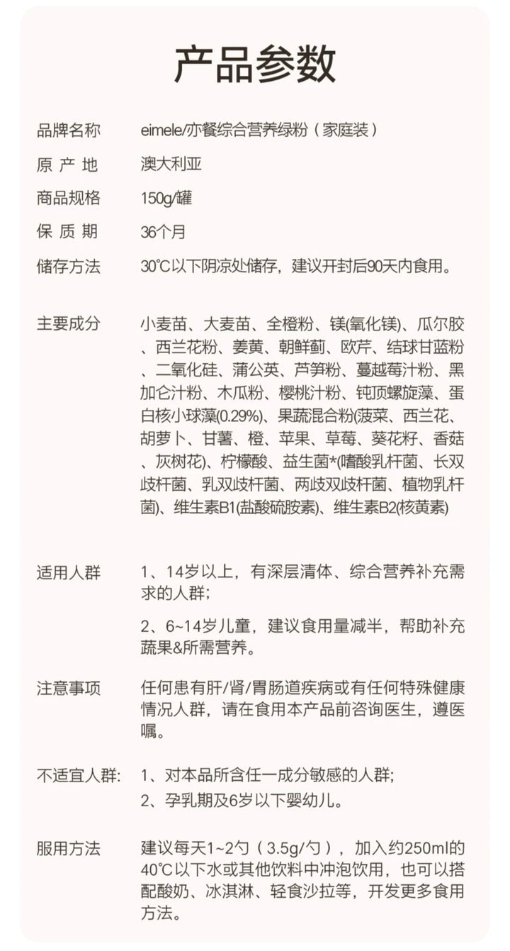 主要成分:小麦苗、大麦苗、全橙粉、镁(氧化镁)、瓜尔胶、西兰花粉、姜黄、朝鲜蓟、欧芹、结球甘蓝粉、二氧化硅、蒲公英、芦笋粉、蔓越莓汁粉、黑加仑汁粉、木瓜粉、樱桃汁粉、钝顶螺旋藻、蛋白核小球藻(0.29%) 果蔬混合粉(菠菜、西兰花、胡萝卜、甘薯、橙、苹果、草莓、葵花籽、香菇、灰树花)、柠檬酸、益生菌*(嗜酸乳杆菌、长双歧杆菌、乳双歧杆菌、两歧双歧杆菌、植物乳杆菌)、维生素B1(盐酸硫胺素) 维生素B2(核黄素)